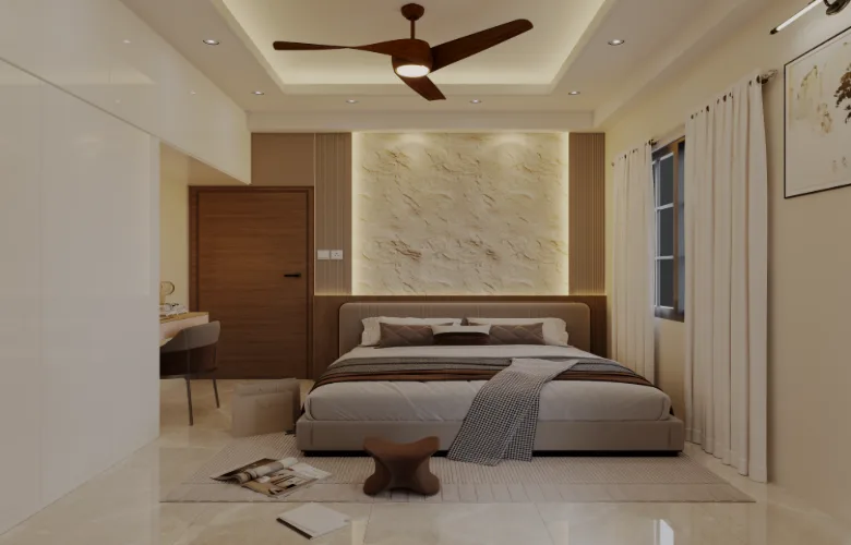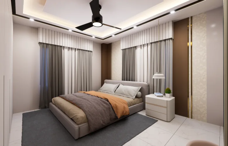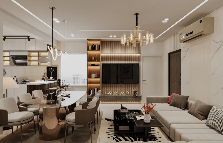 The selected color palette is tightly controlled and layered; beige, taupe, and cream served as a foundation with navy and gold accents providing contrast. Deliberate but muted texture variation included combination of matte panel finishes, reflective flooring surfaces and soft textile finishes to provide variety without visual clutter in continuous sightline conditions.