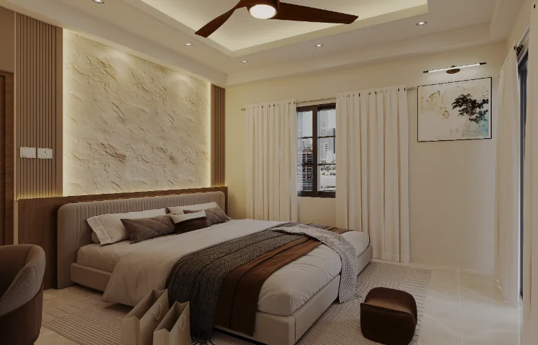 Omar Faruk’s 2,120 sq.ft Basurhat, Companiganj, Noakhali residential interior space was completed within 1 month and 24 days deadline. The purpose of the project was to develop an inclusive home space that blends daily routines with social interactions in harmony. Rather than focusing on dramatic effects via materials and lighting, the design creates a calming space by balancing contrasting use of materials and varying lighting levels to provide a peaceful and functional home environment. The defining characteristic of the project is its ability to divide elongated, multi-function spaces into defined, comfortable zones without separating them physically.