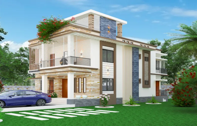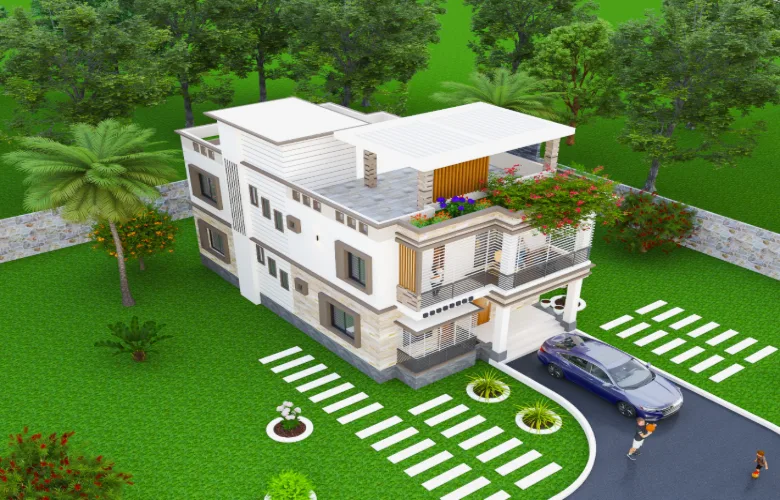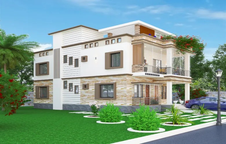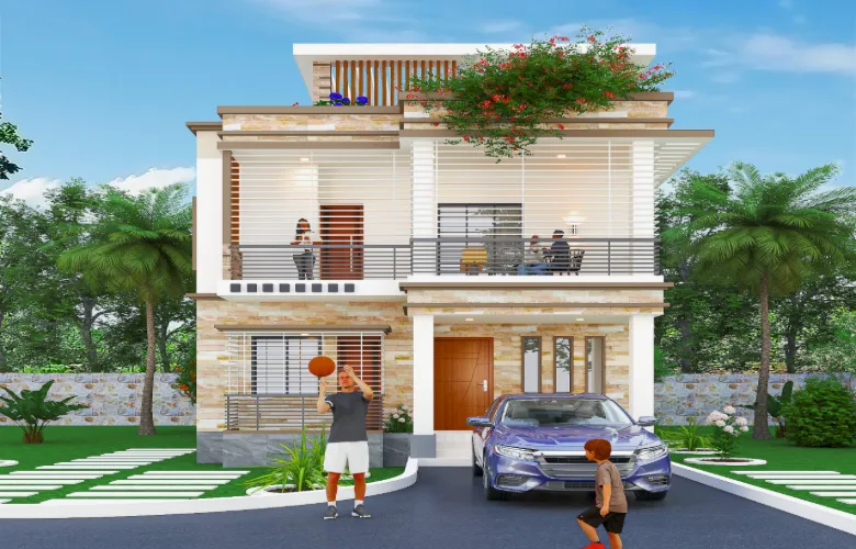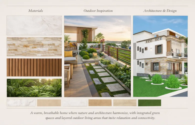 Built-in seating zones in terraces/garden edges serve as functional extensions of architecture. Railings/screens for balconies are designed as integral components as opposed to being afterthoughts. Therefore visual cohesion is achieved across all elevation planes.
