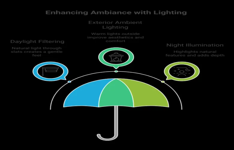 Daylight played a major role in establishing an ambience within the home. Slated balcony screens filter daylight while reducing glare and heat. Warm ambient lighting during nighttime hours emphasizes architectural edges and landscape features. Overall ambiance is quiet/residential with gradual transition between indoor/outdoor lighting conditions.
