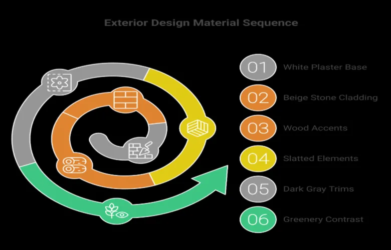 Neutral color scheme (white, beige, gray, natural wood) supported by prominent use of green as accent color through landscaping. Contrast between textures (smooth plaster, rough stone, soft vegetation) adds depth without creating visual over load.
