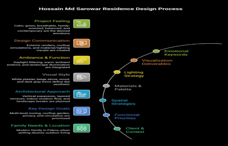 This is a 3,260 sq.ft residential interior led architectural house for Client Hossain Md Sarowar in Chandmari Road, Chalkpailanpur, Pabna. The focus of the design is on an urban family’s residential space, which increases the quality of their lives vertically through the use of balconies and rooftop gardens. The primary objective of the project is to incorporate nature into every day family activities while maintaining both privacy and functionality. A continuous flow exists between the internal spaces, the landscaped external spaces and the layered facade elements in order to create a unique identity for the building.