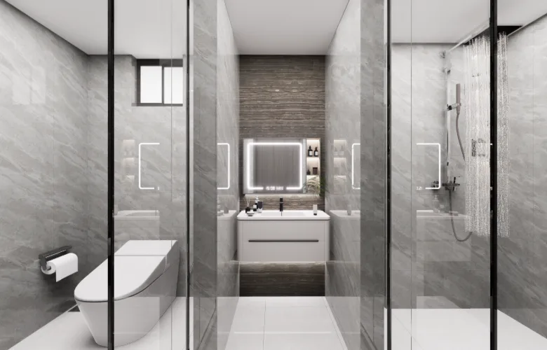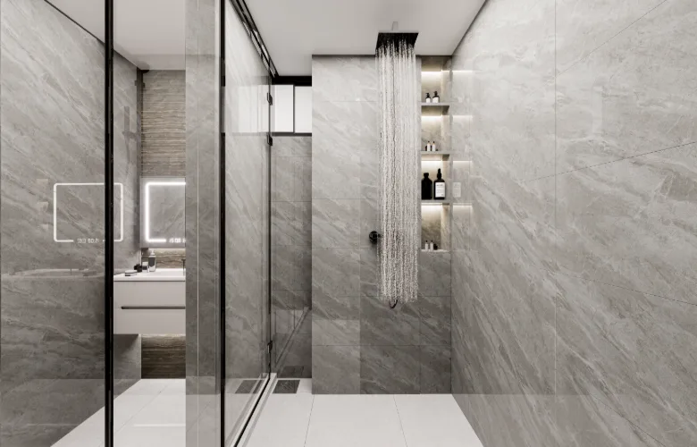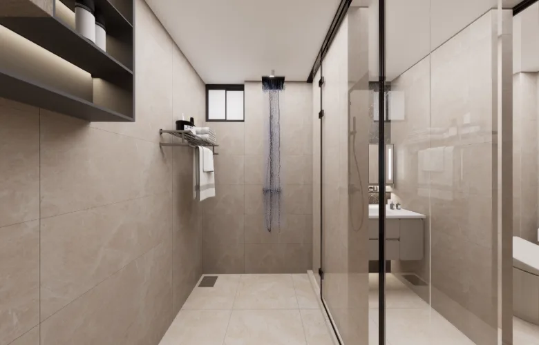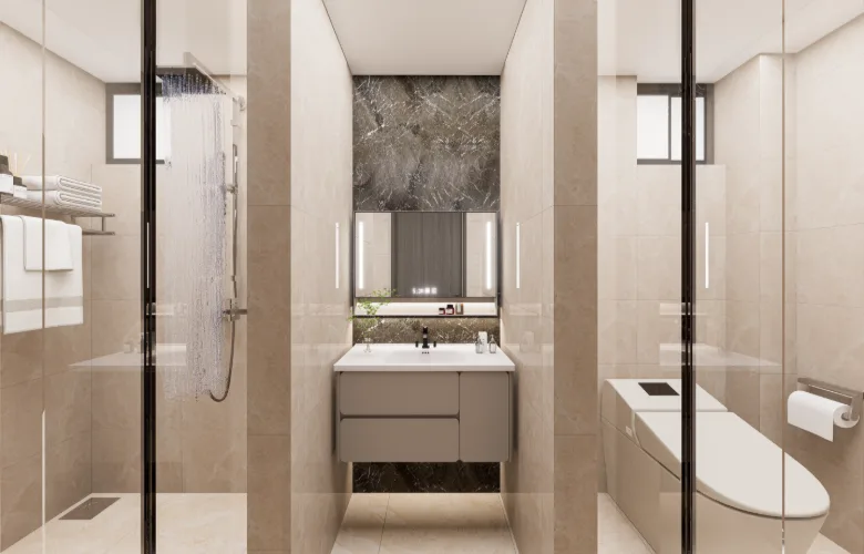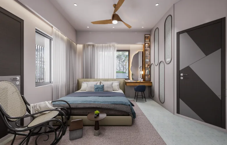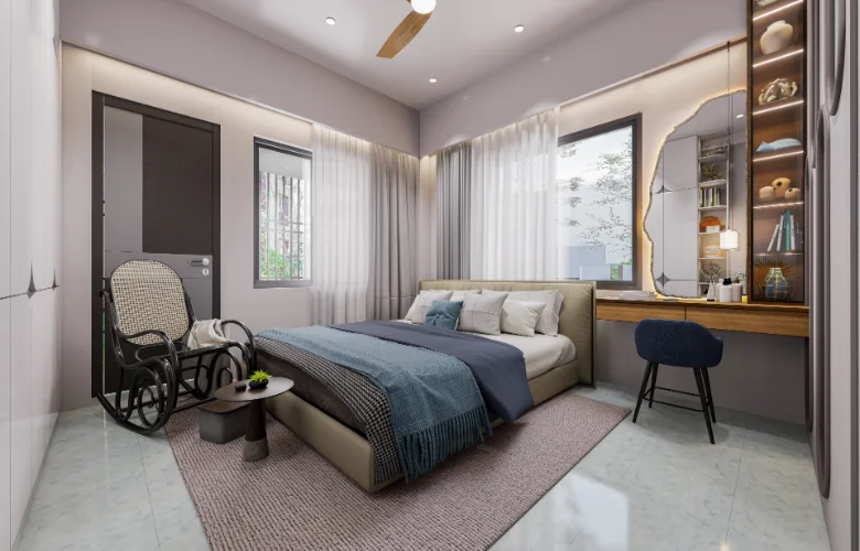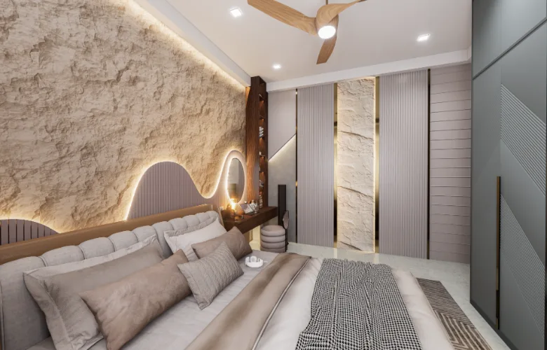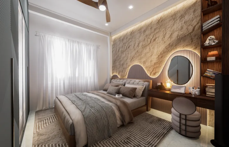 All custom storage and vanity units are fully incorporated into the architecture. Modern furniture choices include soft edges and neutral upholstery consistent with the overall tone of the space.