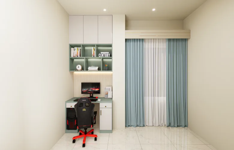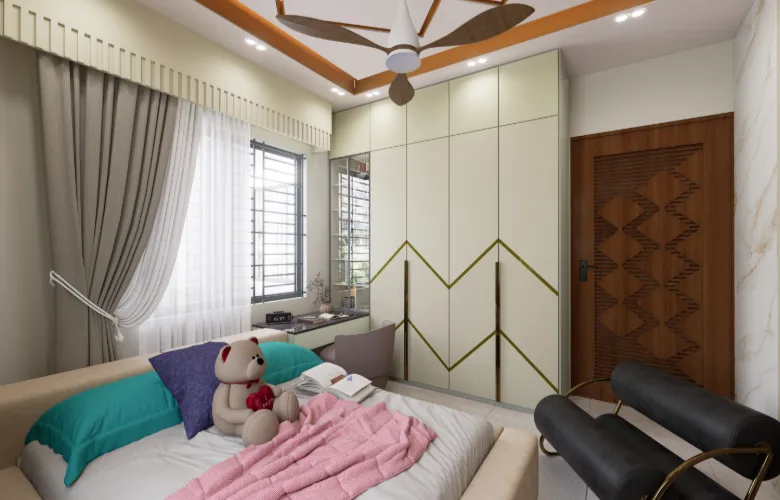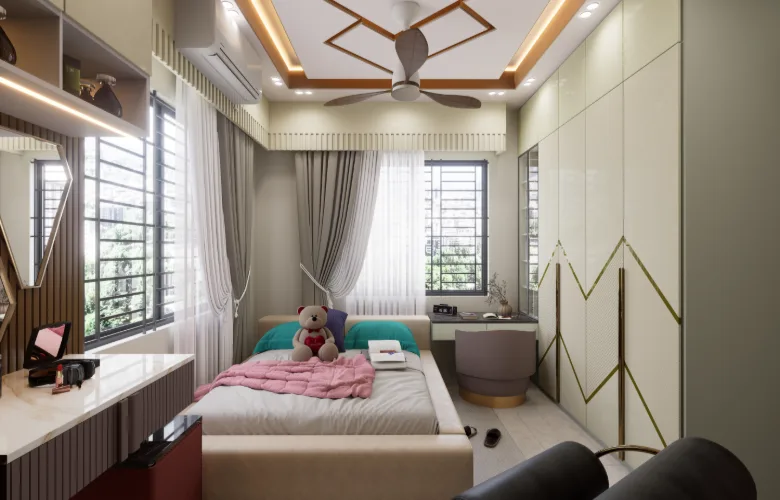 - Utilizing built-in clothing storage units, and desk areas reduces reliance on mobile furniture thereby allowing for maximum usage of floor space.