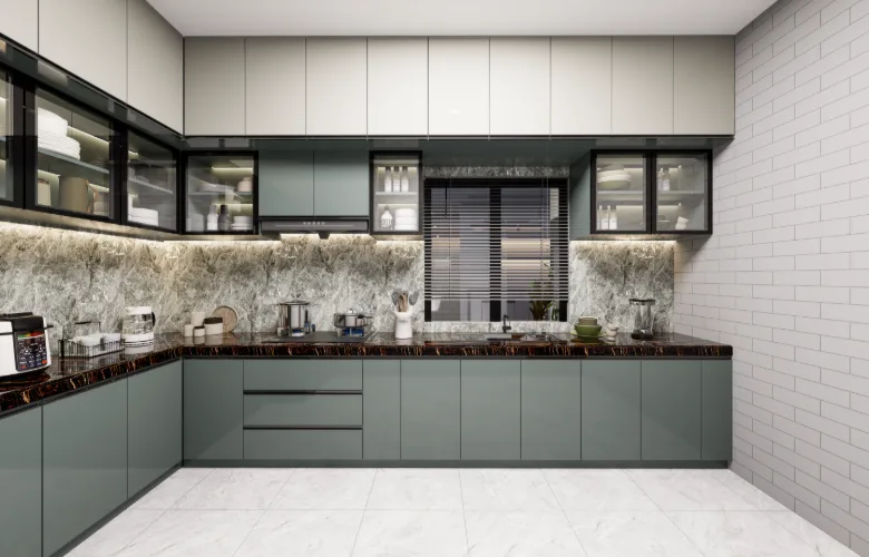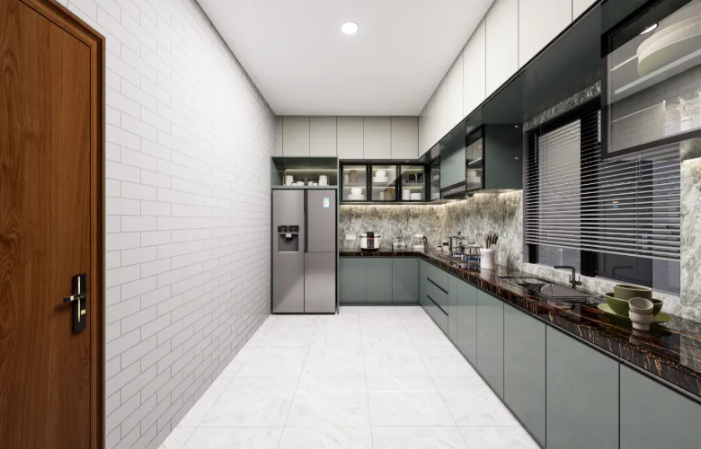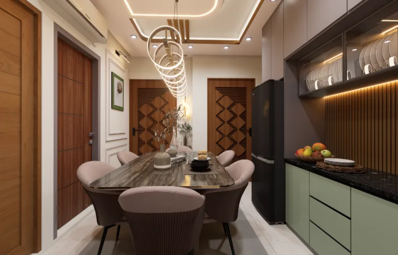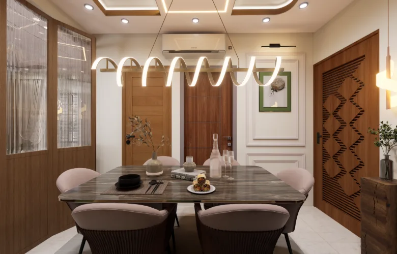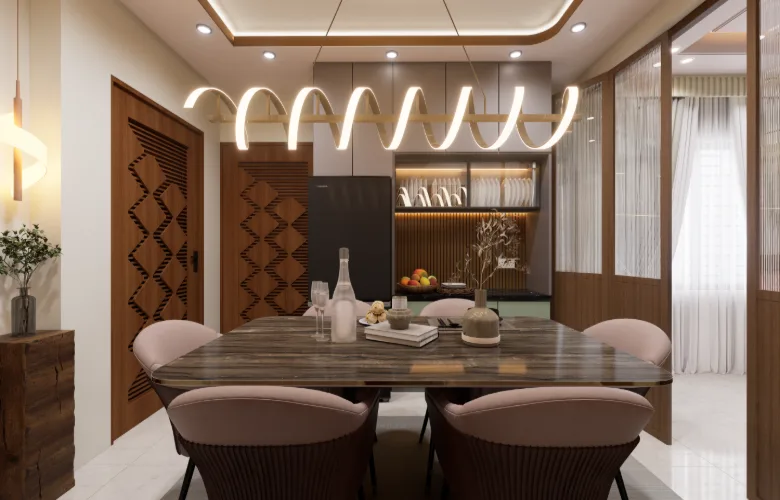 Flooring that is polished and walls that are smooth contribute to brightness throughout the apartment. Warmth is added via wood veneers and laminates in wardrobe and door applications. A luxurious element is introduced through marble-like surfaces for dining table tops without overwhelming the remaining palette.