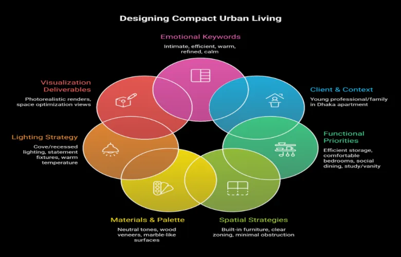 The project was developed using detailed 3-D static image renderings focusing on achieving balance between spatial efficiency and balanced lighting. These images allowed the client to visualize how compact areas would appear when furnished particularly how built-in components interact with pathways of circulation. Clarity provided in visualizations enabled approval processes to run smoothly, minimizing changes made during construction phases