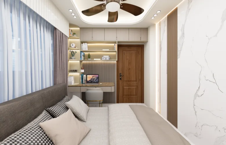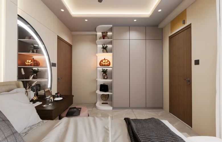 A: Built-in wardrobe units, shelf niche areas and multi-functional wall mounted furniture pieces were all used to provide ample storage opportunities within the space constraints.