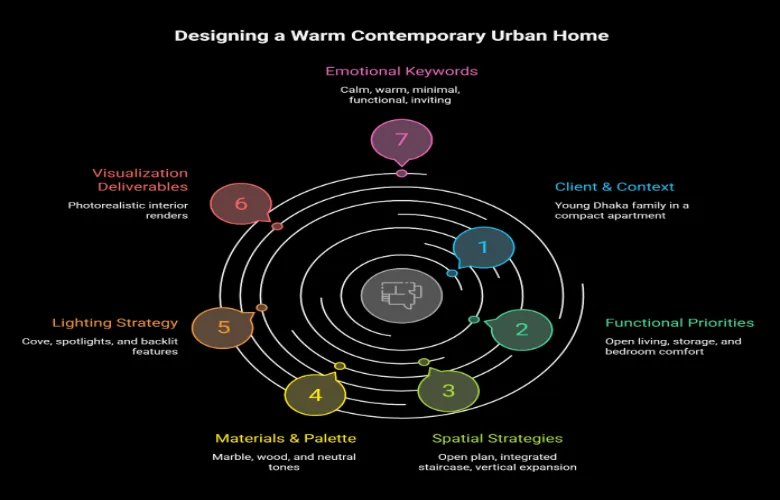 This is an intimate 1,089 square-foot residential interior for Md. Mahim Mia in Manda, Sabujbag, Dhaka. The project was created specifically for a young couple’s modern family. The primary goal of this project was to develop a warm and sophisticated contemporary living area, which could provide both comfort and visual appeal. In just one month, the design transformed an ordinary urban apartment into a spacious, open, and very functional home. The most distinctive aspect of this design was its ability to provide a sense of spaciousness and refinement in spite of spatial and structural limitations.