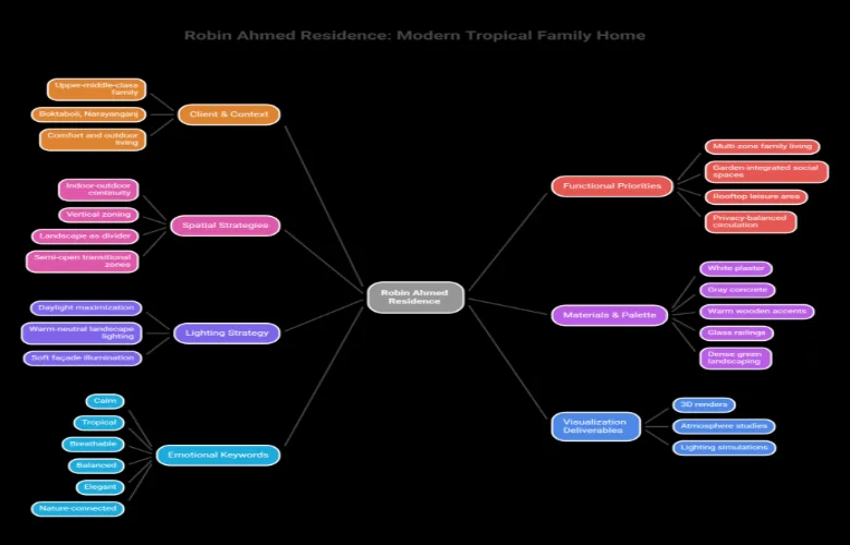 This contemporary residential interior-led home for client Robin Ahmed, measures 2,183 sq. ft., is currently under construction in Boktaboli, Narayanganj, and will be a dwelling place for a modern upper-middle class family which has been searching for a balance between being aesthetically pleasing, yet comfortable for their daily lives. The building’s architecture seeks to expand upon the idea of living space beyond simply encloseable rooms by incorporating garden spaces, terraces, and rooftop spaces. The essence of this building lies in its ability to seamlessly move between indoor living spaces and the landscaped, resort-like outdoor environment.