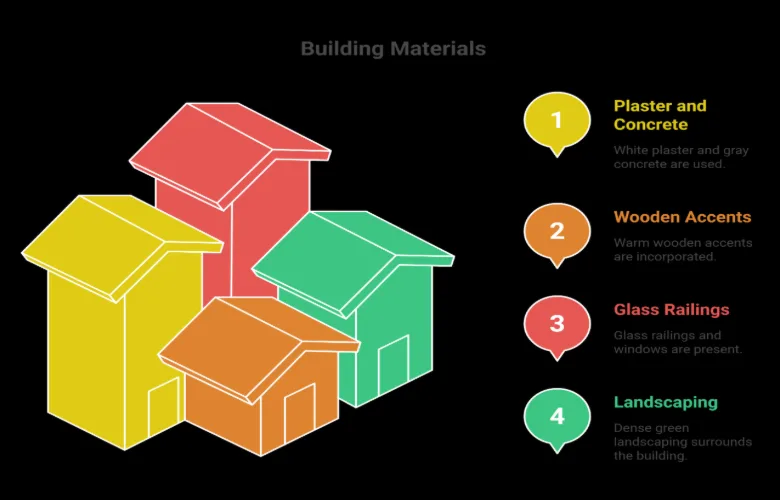 Smooth white plaster, gray concrete texture finishes, warm wood accent finishes, and numerous glass components comprise the material palette. These materials produce a controlled contrast – solid surface components provide structural integrity, while glass and vegetation add lightness/openness to the space.।
